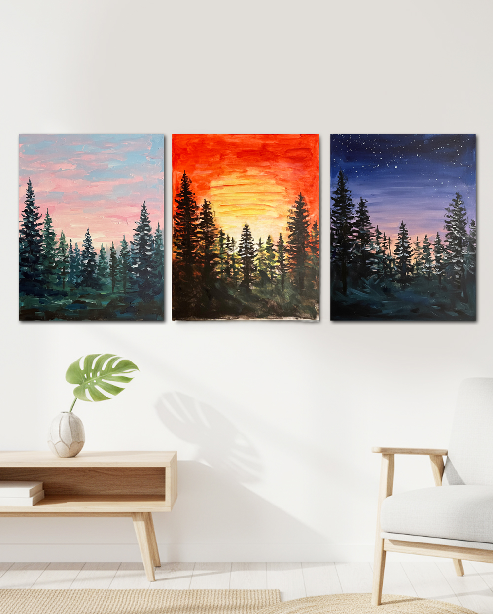 Schwarze Silhouetten des Waldes treffen auf eine glühende Sonne in Rot und Gelb. In diesem Mal-Event spielen wir mit starken Kontrasten, Emotionen und Licht. Ein Bild voller Gefühl, Abendruhe und Magie.