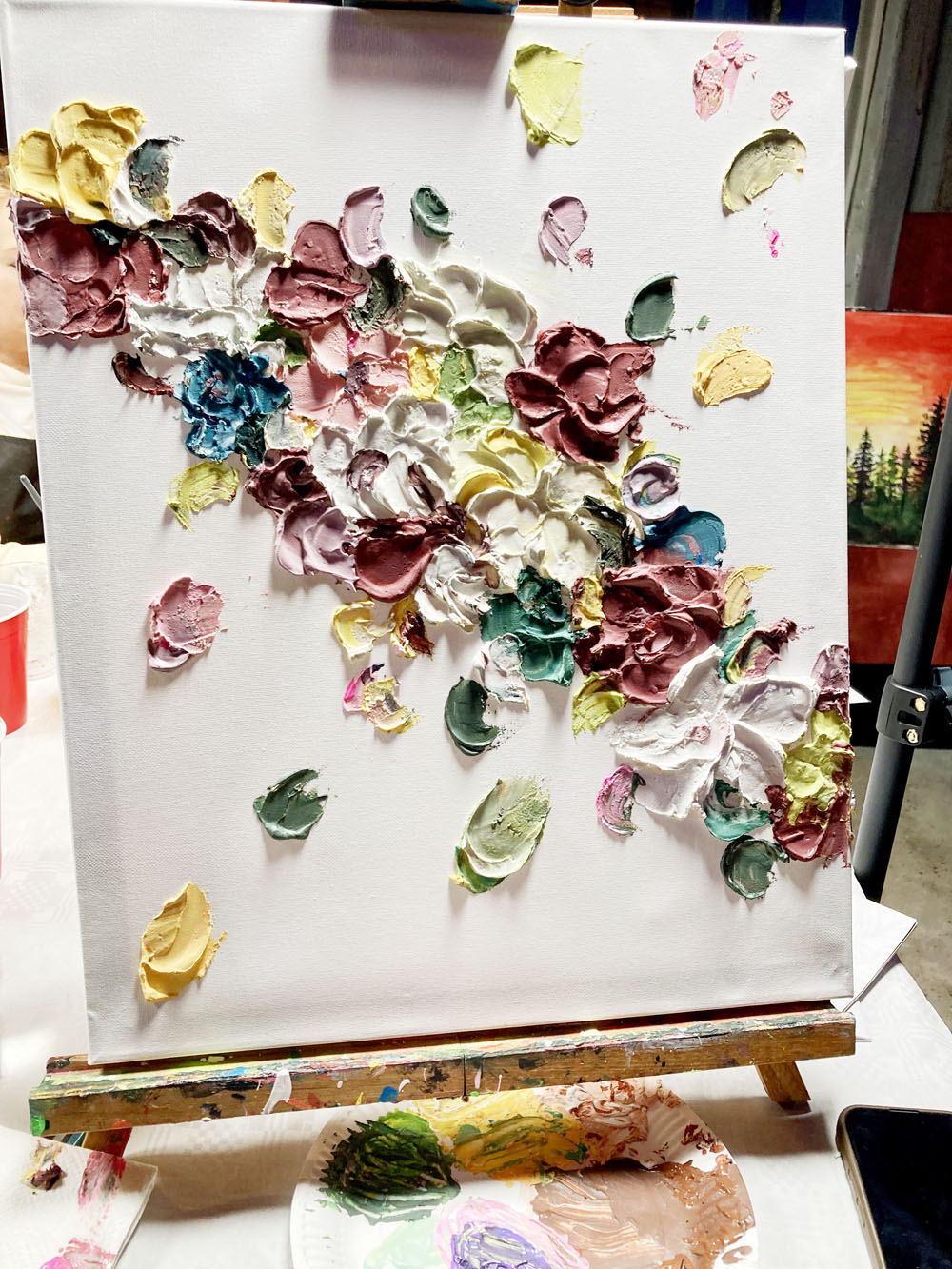 • 🎨 Alle Materialien (Acrylfarben, Staffelei, Pinsel, Schürze, Leinwand 40×50 cm) stehen für dich bereit